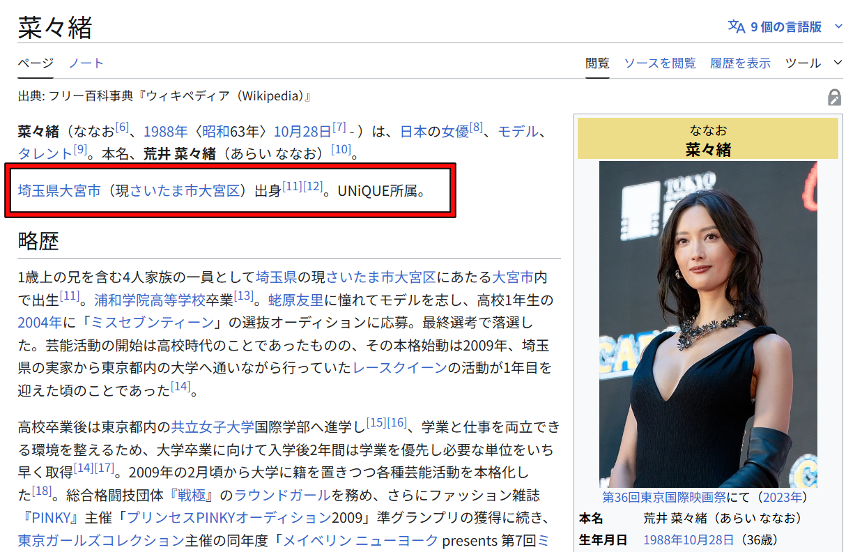 菜々緒さんの公式プロフィールには、埼玉県大宮市出身の日本人と明記されています。