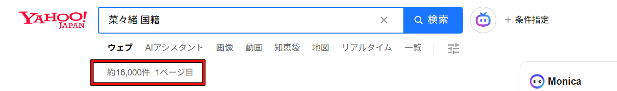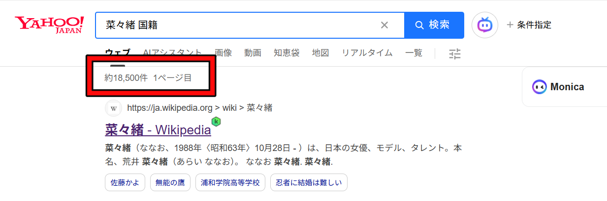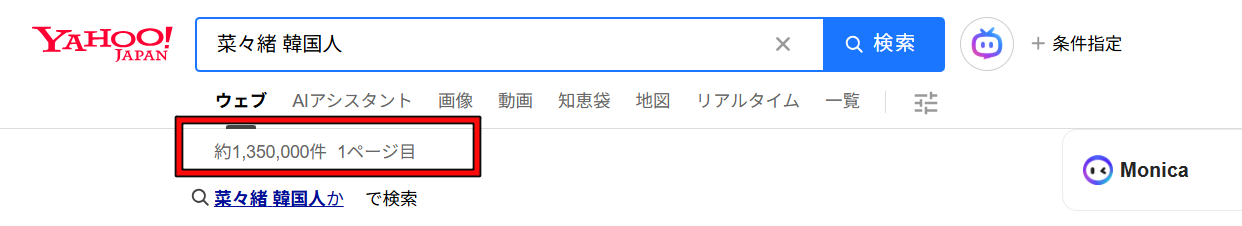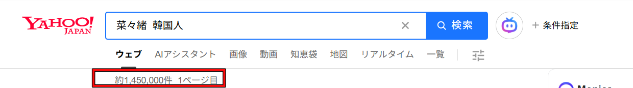 検索数が増えると、GoogleやYahoo!の検索候補に「菜々緒 韓国人」「菜々緒 国籍」と自動的に表示されるようになります。